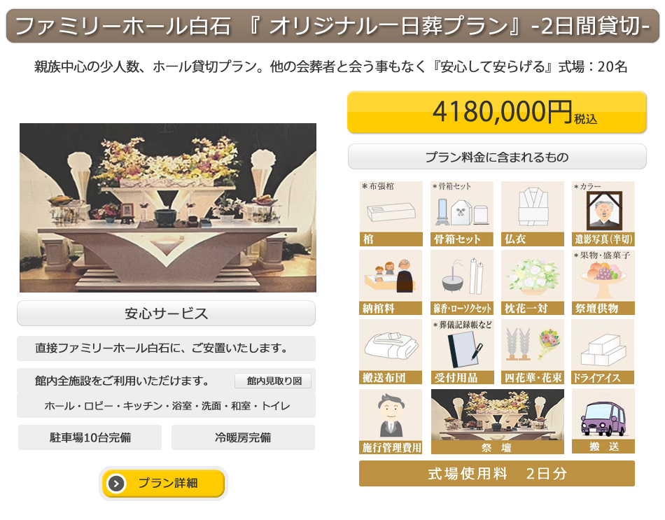 病院で死亡を告げられ、ご遺体の安置先がわらない、葬儀の流れが解らない、葬儀費用がいくらかかるか解らない、お骨になったらどこに埋葬しようか解らない、次々と思い浮かぶ、そんな不安は「フアミリーホール白石」にご相談下さい。