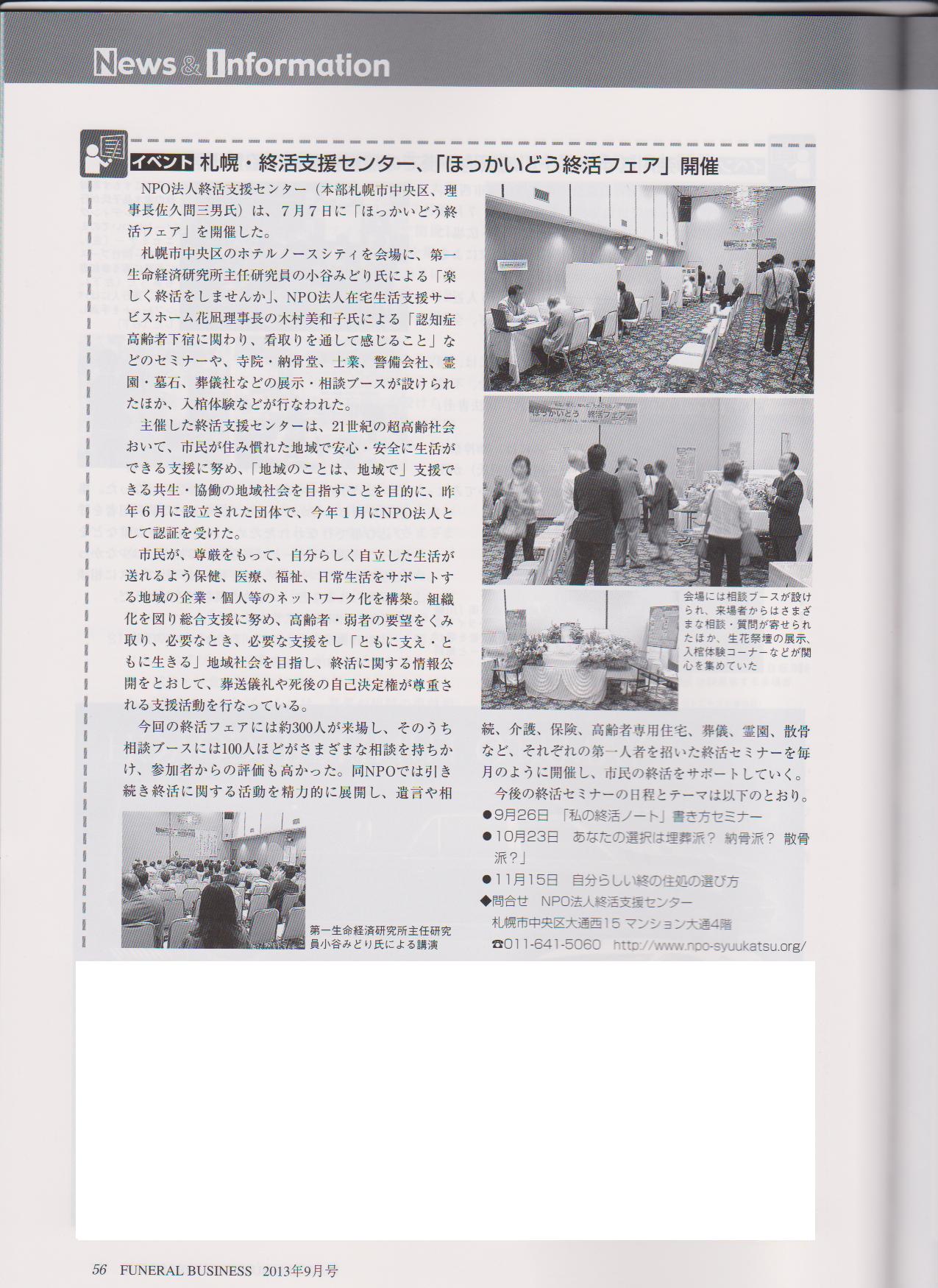 「ほっかいどう終活フェア」が月刊誌「フューネラルビジネス」9月号に掲載 2013年8月27日 最終更新日時 : 2013年8月27日 suzuki 葬儀関係の月刊誌「フューネラルビジネス」9月号に 「特定非営利活動法人 終活支援センター」が 開催した、「ほっかいどう終活フェア」の内容が 掲載されました。 マスコミに取り上げられる機会が多くなりましたが 道民に期待される、活動をしていきたいと 決意する日々です。 FacebooktwitterHatena