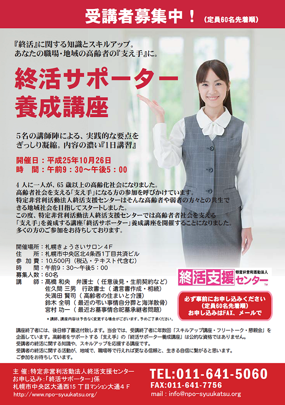 札幌市で開催「終活サポーター」養成講座 25年10月26日(土曜日)