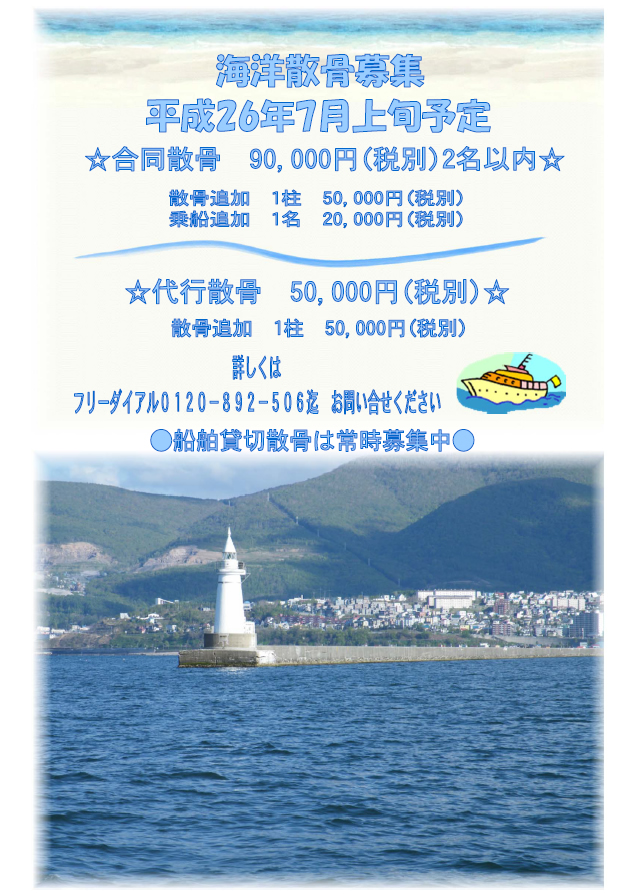 札幌で小樽沖での海洋散骨は「フアミリーホール白石」まで、 2014年5月19日 最終更新日時 : 2014年5月19日 suzuki 短い北国の夏到来です。 今年も、札幌での海洋散骨、小樽沖海洋散骨の 企画を行いました。 お申込は 家族葬 直葬のフアミリーホール白石 自分葬のパイオニア (株)セレモニーきょうどう フリーダイアル0120-892-506 迄 合同散骨 代行散骨の募集は、7月上旬に行う予定です。 船を貸し切りで行う海洋散骨は、常時募集しています。 FacebooktwitterHatena