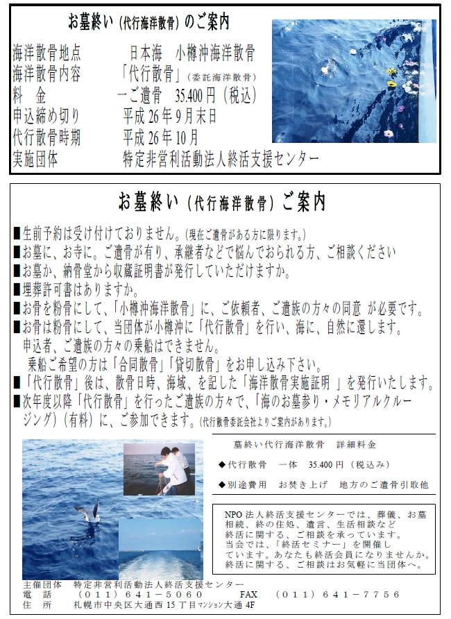 NPO法人終活支援センターが「お墓終い」代行海洋散骨 35.400円(税込)で募集しています。