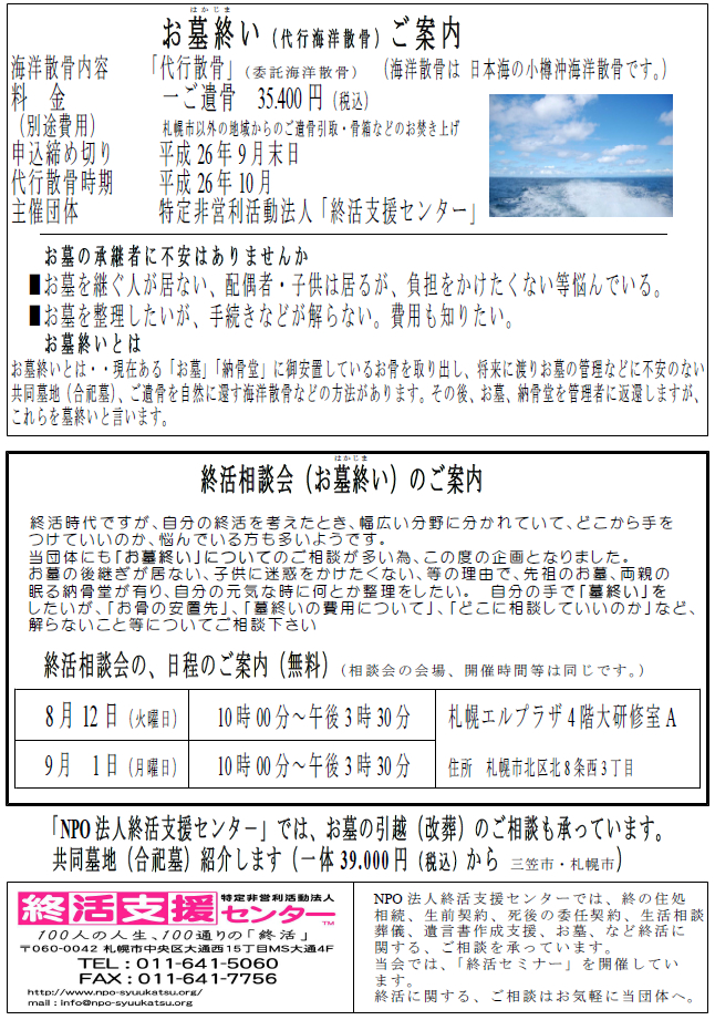 「お墓終(はかじま)い」相談会(無料)北海道・札幌市で相談会26年8月12日10時から16時迄札幌市エルプラザにて開催