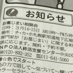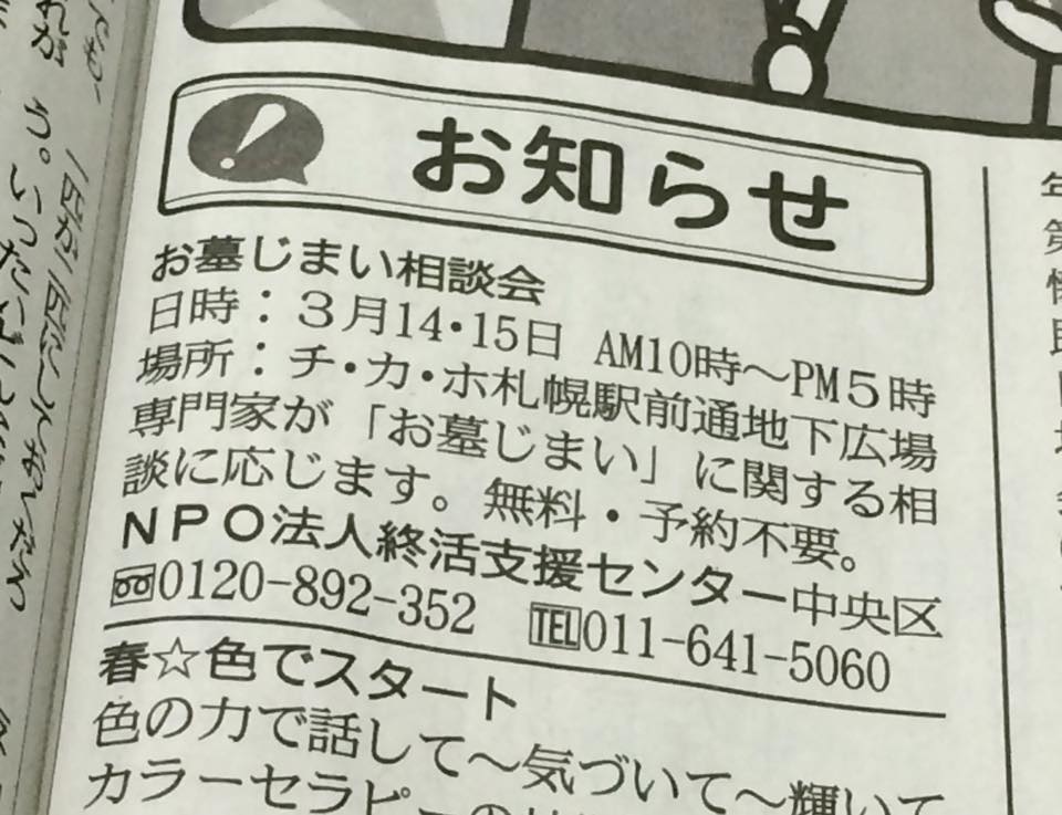 チ・カ・ホ札幌駅前地下広場で「終活」無料相談会3月14日(土曜日)15日(日曜日)10時から17時 2015年3月11日 最終更新日時 : 2015年3月11日 suzuki チ・カ・ホ札幌駅前地下広場で「終活」無料相談会を、 平成27年3月14日(土曜日)3月15日(日曜日) 10時から17時まで開催します。 終活・お墓じまい・葬儀・家族葬・終活ノートなど 是非お立ち寄り下さい。お待ちしています。 FacebooktwitterHatena