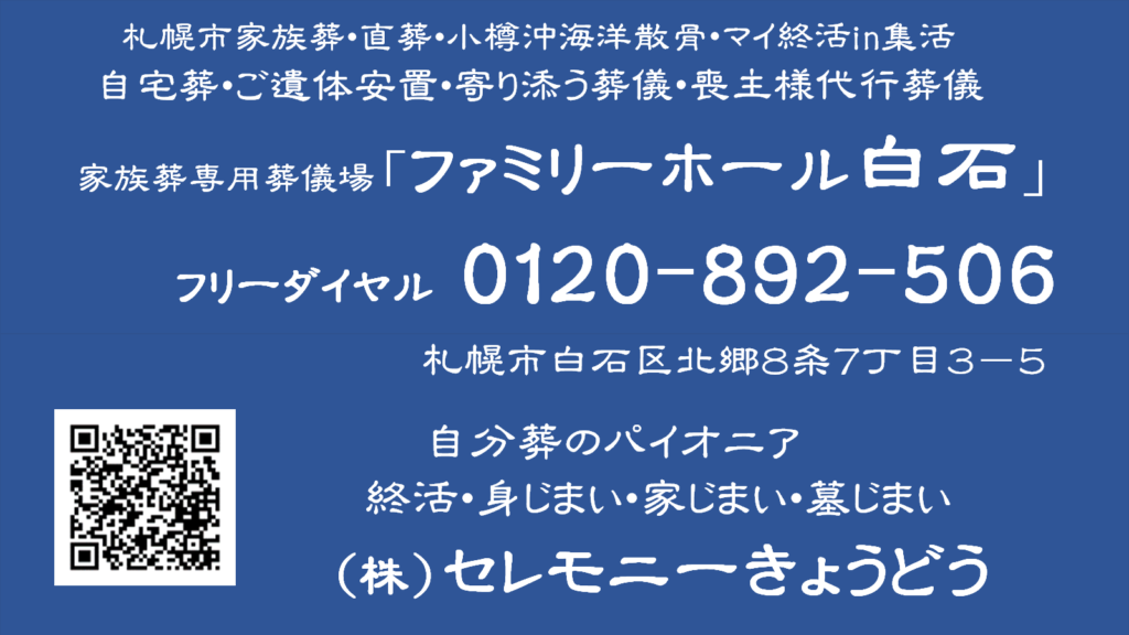 YouTube 全ちゃんチャンネル「札幌の葬儀屋 10年前と今!! 葬儀費用の移り変わり」、家族葬札幌市・自宅葬・直葬「ファミリーホール白石」、終活・海洋散骨札幌市「セレモニーきょうどう」、札幌市直葬・自宅葬ブログ