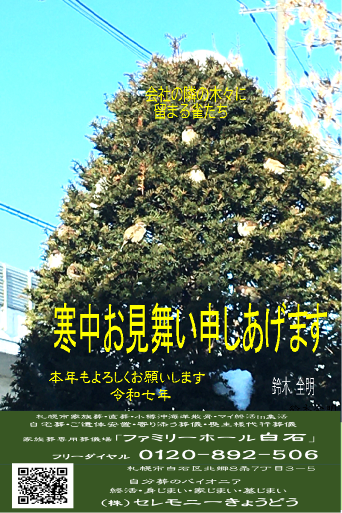 2025年 令和7年 寒中見舞い申し上げます。自分葬、小樽沖海洋散骨「(株)セレモニーきょう」、家族葬 直葬 自宅葬「ファミリーホール白石」