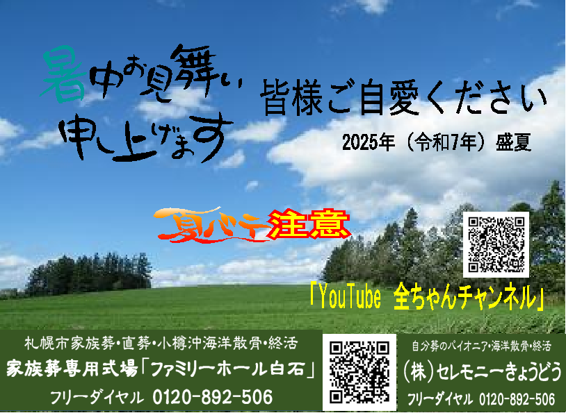 暑中見舞い申し上げます 2025年 盛夏、家族葬札幌市・白石区「フアミリーホール白石」、終活・自宅葬「セレモニーきょうどう」、YouTube家族葬・散骨・全ちゃんチャンネル、葬儀・終活ブログ。