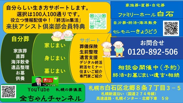 札幌市で家族葬・葬儀の情報は、「札幌の葬儀屋YouTube全ちゃんチャンネル」を視聴になれば、参考になります。